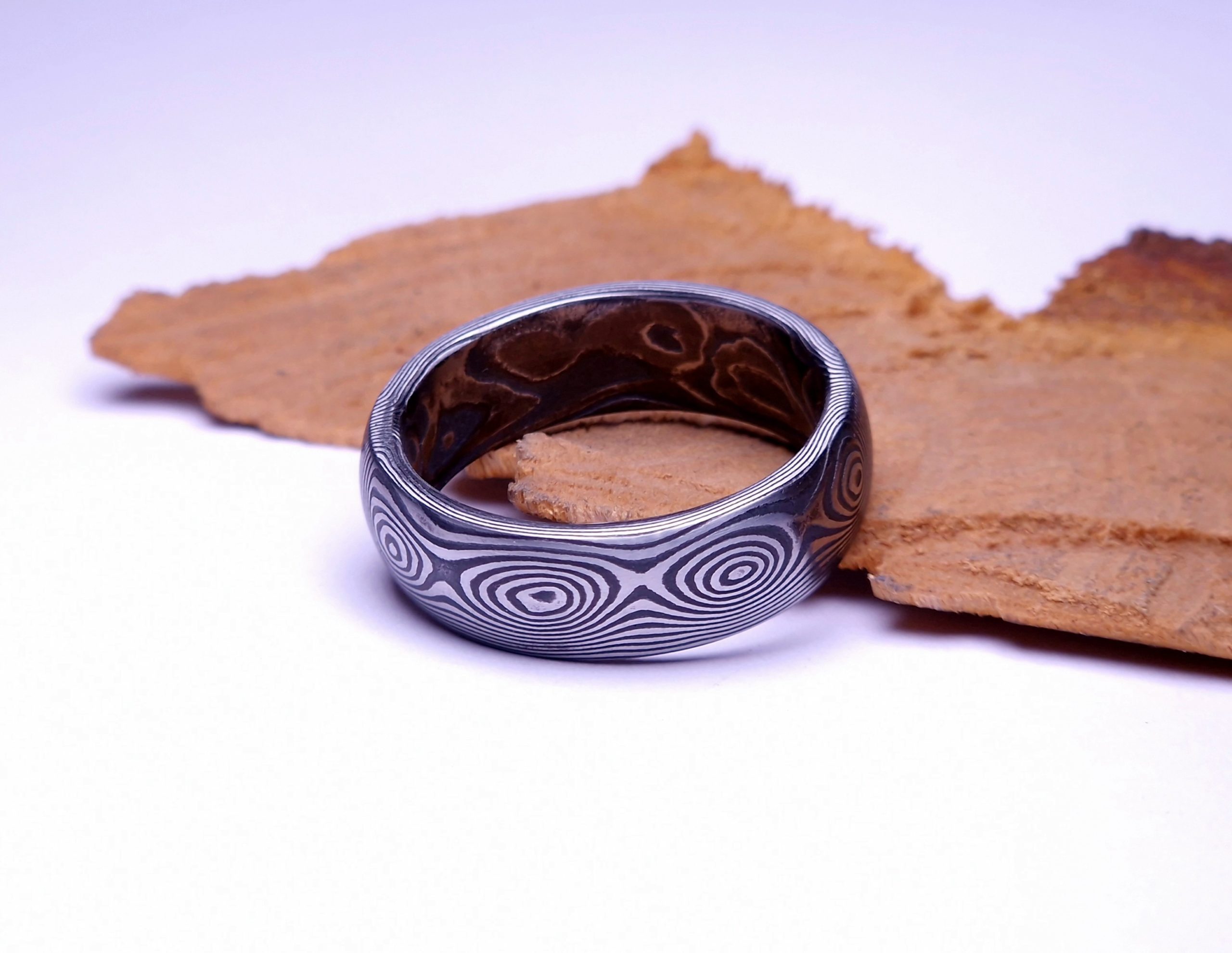 Bytelný prsten z vrstvené nerezové oceli damasteel. Prsten je žárově černený, vzor výrazný,