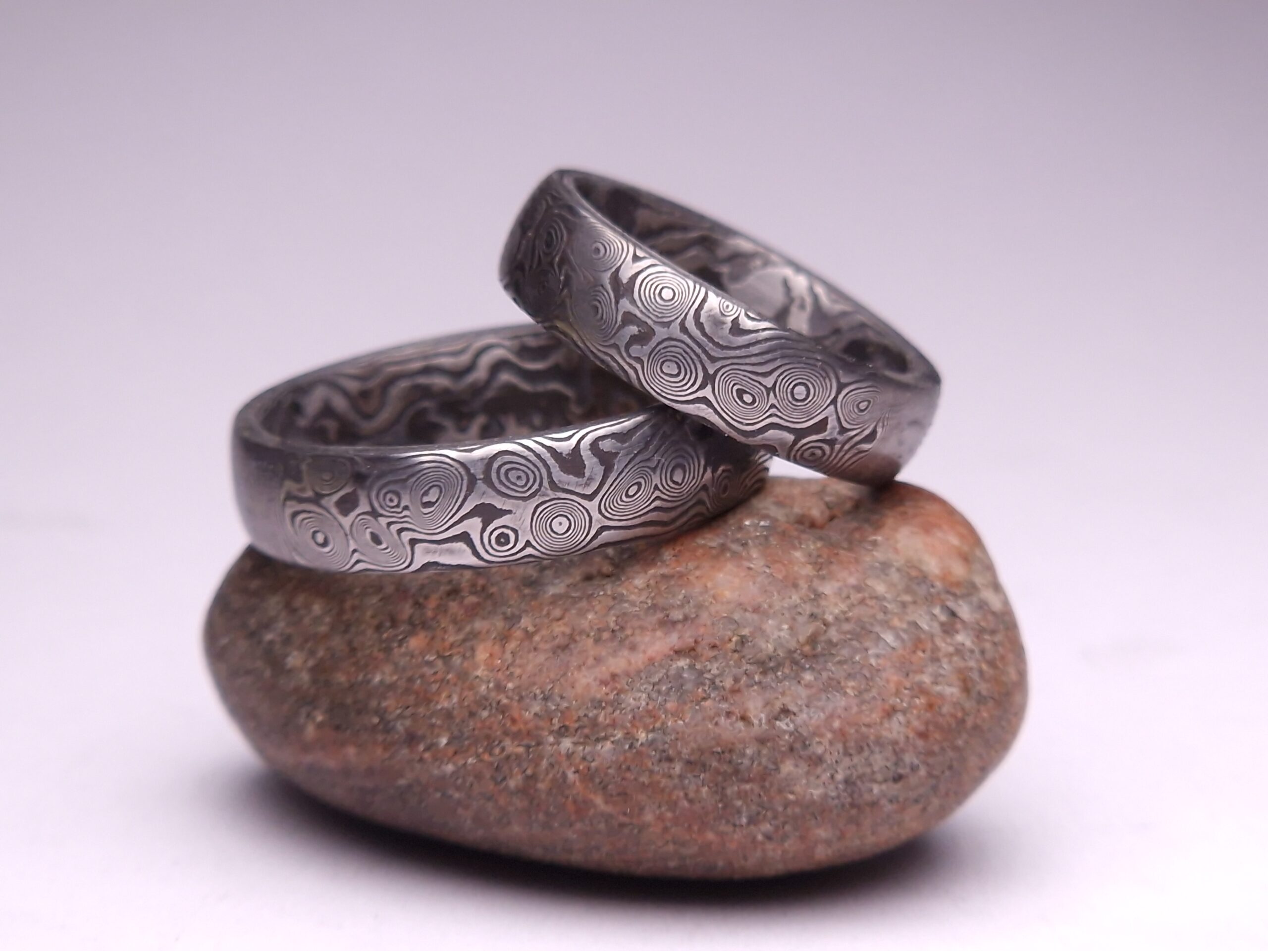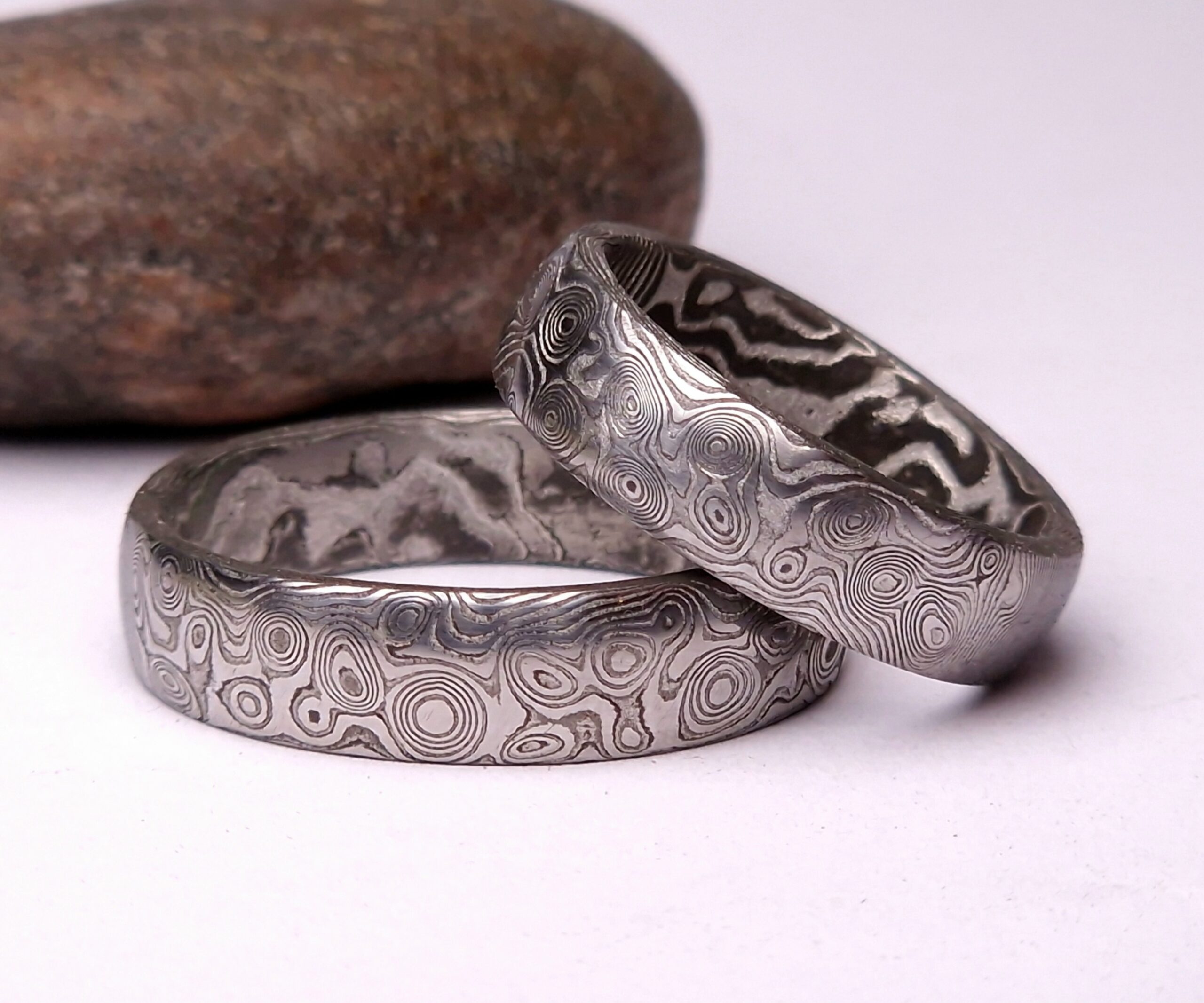 Nevšední prsteny z vrstvené nerezové oceli damasteel. Originální vzor s motivem dopadajících „kapek“.