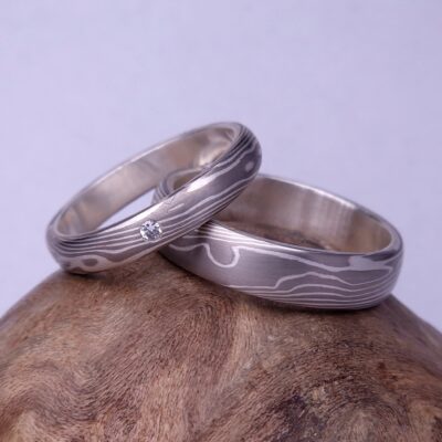 Mokume gane prsten z  bílého paladiového zlata 585 a stříbra 925 s briliantem o průměru 2 mm.