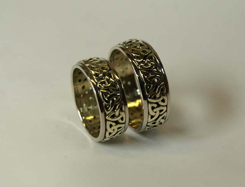 Snubní prsteny s keltským motivem (triquetra) žluté zlato 585/1000, bílé zlato 585/1000, možná celková šíře 6 až 8 mm.